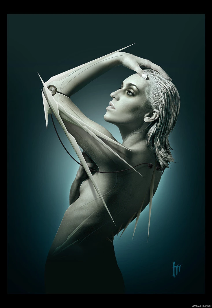 mechanical parts, such as metallic components and wires integrated into their body structure. This blending of human and machine features suggests the concept of cybernetics or