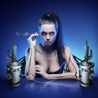 robotic parts attached to her. She appears to be in