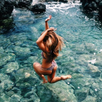 The picture shows a person, likely a girl or woman, from behind as she jumps into water. She appears to be in mid-air, suggesting she might be jumping off rocks into the ocean. The environment suggests it could be a beach or coastal area with clear