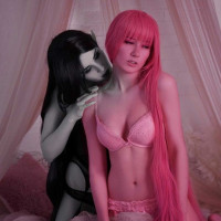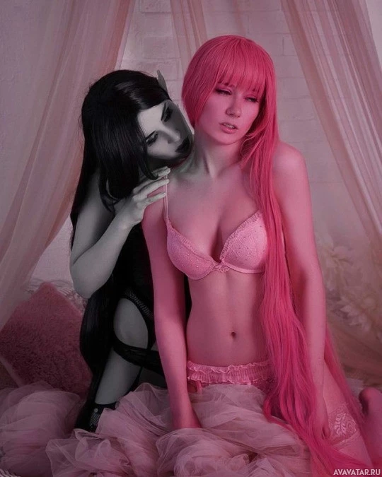 Princess Bubblegum, also in a costume that represents her typical attire from the series. The characters are depicted interacting with each other, suggesting intimacy or playfulness between them.