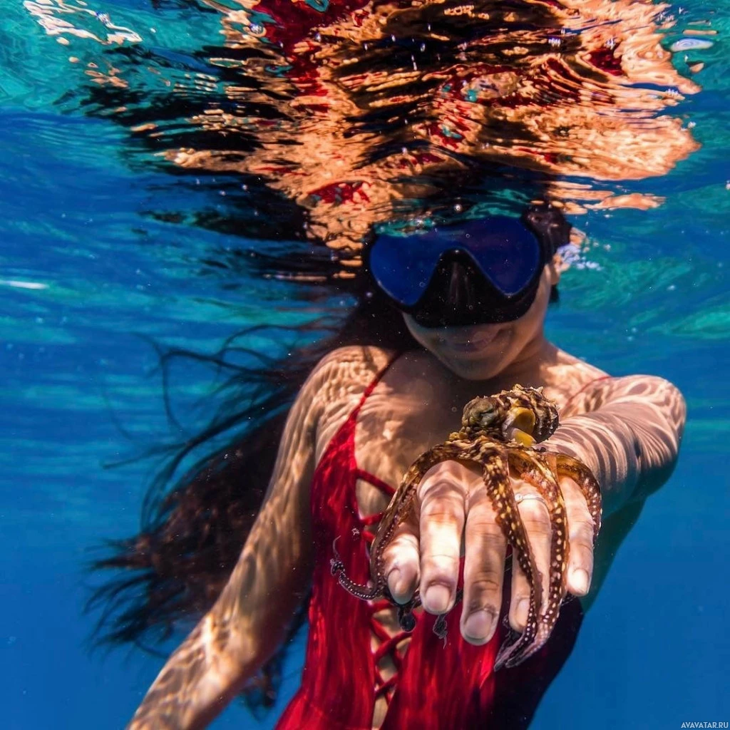 sea creature. Their right hand is extended towards what looks like an octopus resting on their fingers. The scene takes place underwater, likely during a snorkeling or