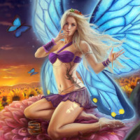 blonde hair and wings. She is sitting on what appears to be a magical flower or plant, given its
