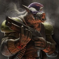 The image features a character that appears to be a mutant, resembling a pig with human-like arms and legs. This character is wearing