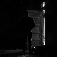 an open window or doorway with one arm resting on the windowsill. The lighting creates