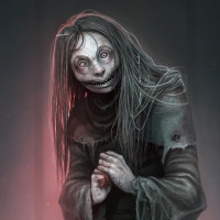 wavy hair that could suggest she is of a supernatural or undead nature. She is dressed in tattered clothing with a hood and seems to be standing amidst a desolate,