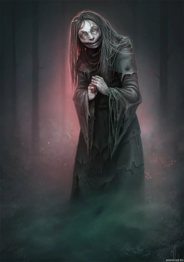 the horror genre. The character has pale skin, dark eye sockets, and long,