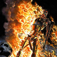 a dramatic pose amidst flames and smoke, suggesting a chaotic or intense situation. The background suggests destruction and conflict. There are skulls and fire visible, which might imply a violent or battle-filled scenario. The artwork conveys the character's endurance and resilience in