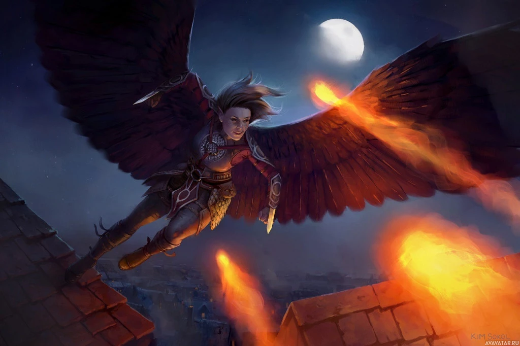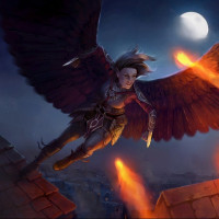 a dramatic scene involving fire or destruction. The wings of the character are prominently displayed, indicating flight capability and possibly a connection to divine powers or