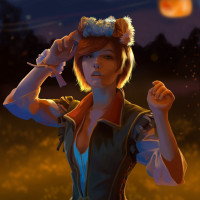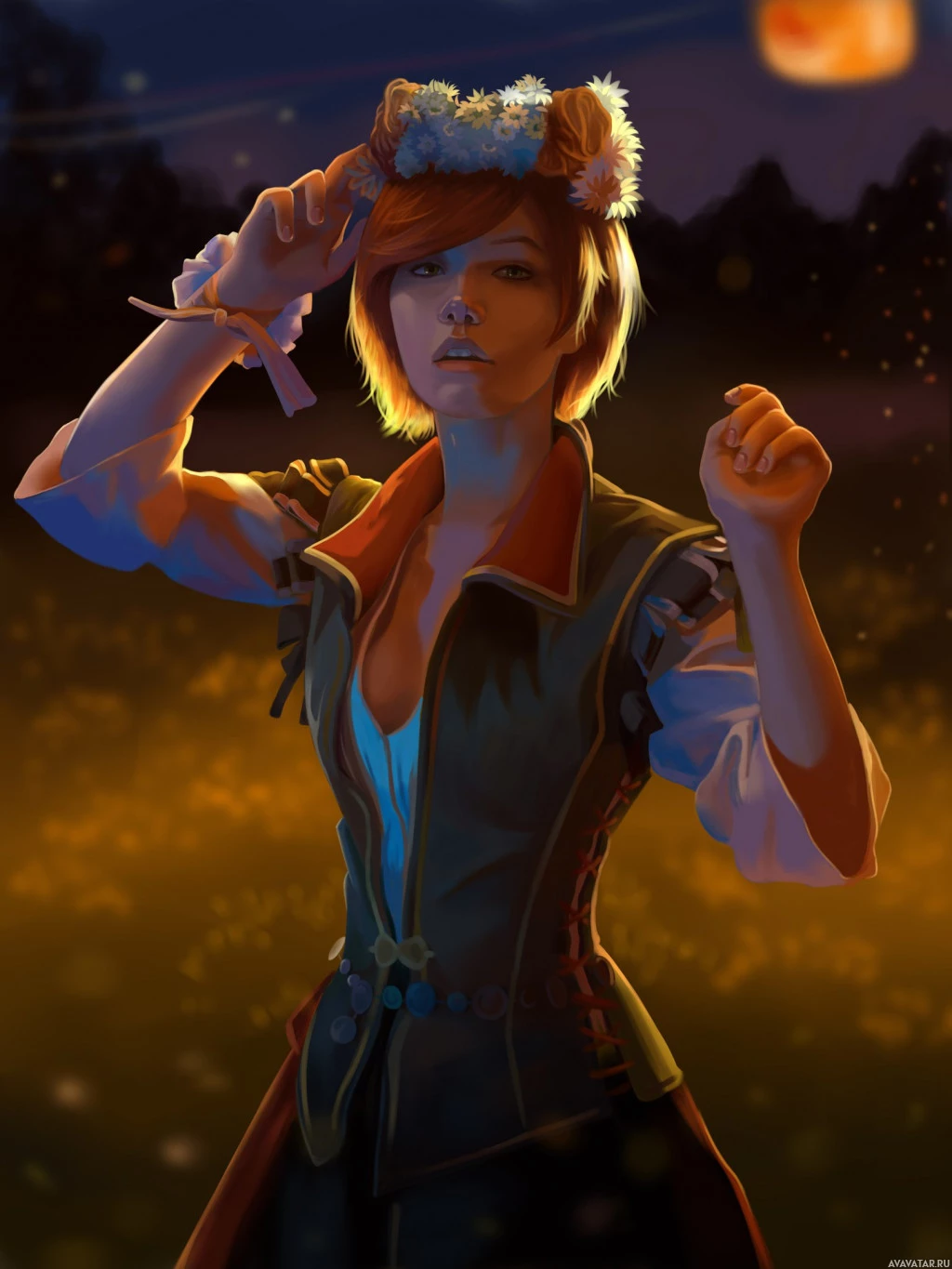 short hair, unique attire including what looks like a leather corset or armor, and a crown or headdress on her head. She has a confident and poised stance, which could be indicative of her character within