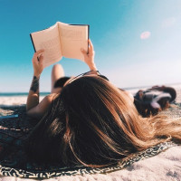 На этой фотографии женщина лежит на спине на пляже. Она читает книгу и, кажется, наслаждается солнечным днем у океана. Небо ясное, что говорит о том, что это может быть яркий и приятный день для активного отдыха, такого как чтение на пляже.