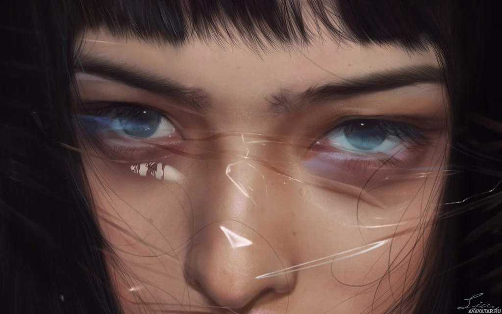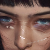 blue eyes, long eyelashes, and short dark hair. There are visible marks or scars on the face that could be interpreted as either tears or some form of