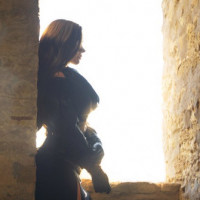 The image depicts a person dressed in cosplay, emulating the character Yennefer from