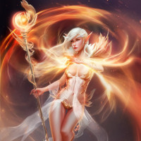 magical attire and wielding a staff that emits a glowing effect, suggesting some sort of magic or enchantment. The background is abstract with swirling patterns that could represent energy or magical elements.