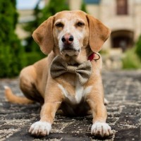 floppy ears, characteristic of breeds like hounds or terriers. On its collar, there's a bowtie that adds