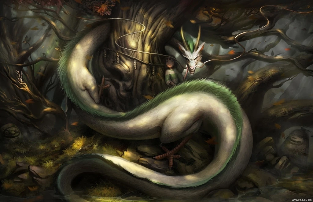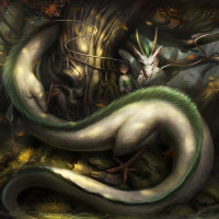 intricate scales and is coiled around the character, creating a sense of intimacy between them. The character stands upright and seems to be interacting with the dragon in some way, possibly engaging in dialogue or offering a treat. This image is commonly associated with fantasy elements and could be related to a story or character from anime or manga genres.