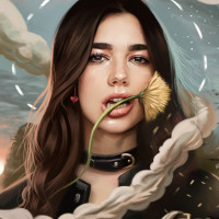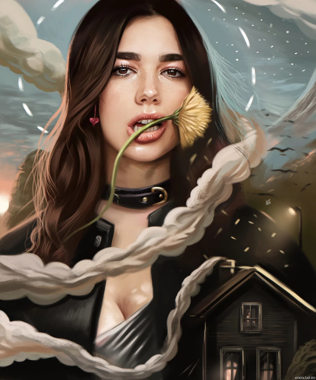 a strong connection with the audience. In her mouth, she has a flower, which adds