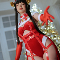 In the image, there is a figure that appears to be a character dressed in a cosplay costume. The character has long black hair and is wearing red and white attire with various ornaments and accessories, including gold accents. The background features Christmas decorations such as lights on trees.