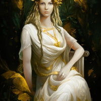 flowing hair that cascades down her shoulders, and she wears a wreath or crown of golden leaves on her head. She is seated in
