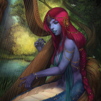 red hair and is adorned with intricate jewelry and a necklace that includes a pendant. The naga is sitting under