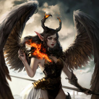 a fantasy character that resembles a succubus. She has large, feathered wings and horns on her head, which are common features for such