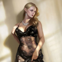 a black lingerie or bodysuit with sheer elements, and her pose is one of allure or seduction. The setting appears to be indoors with