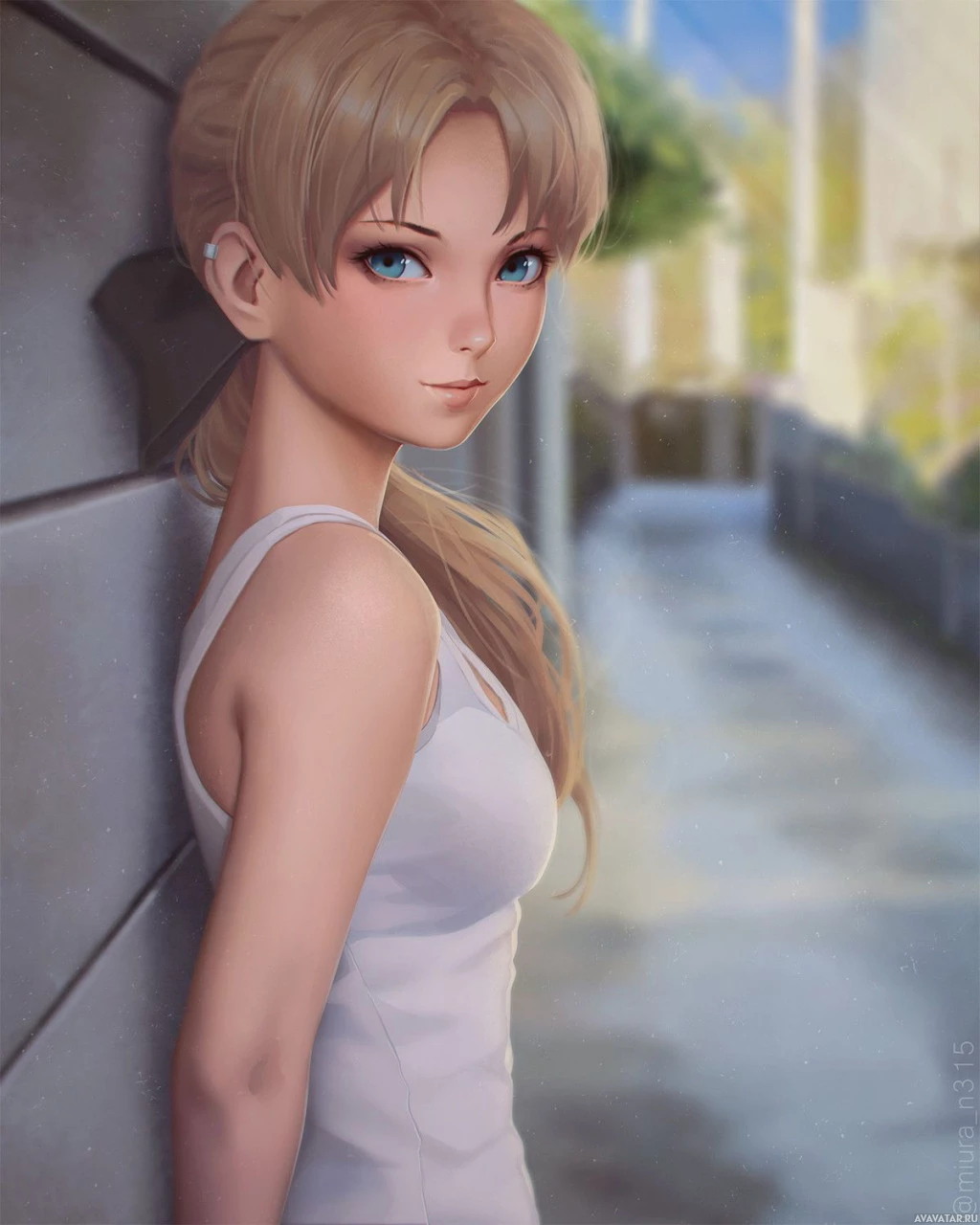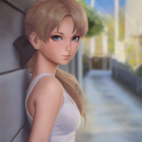 The image shows a female character with blonde hair, wearing what appears to be a white tank top. She is standing by a railing or fence with her head slightly turned away from the camera, giving her a contemplative expression. The background suggests an outdoor setting with some greenery visible behind her. The style of the image indicates it could be from a comic book or manga illustration.
