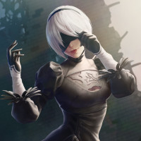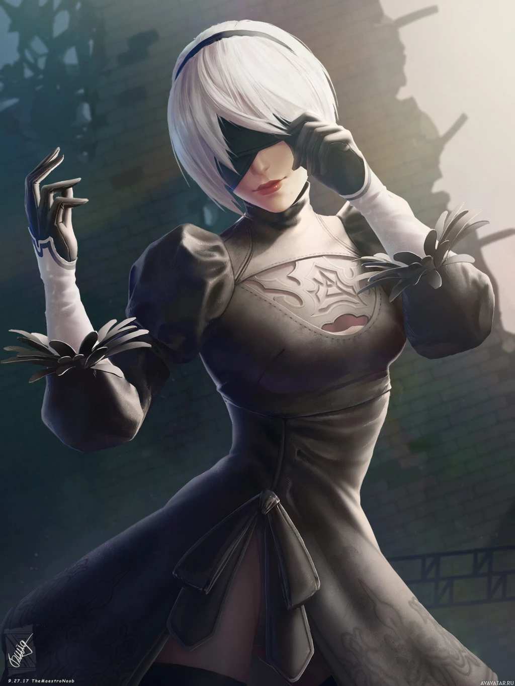 the video game "Nier: Automata." She is depicted wearing a dark, gothic-style outfit with wings and claws on her hands, which is characteristic of her