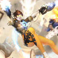 the video game "Overwatch." This character is known as Tracer, and she is shown in action with her abilities activated, which often involve time manipulation and