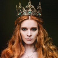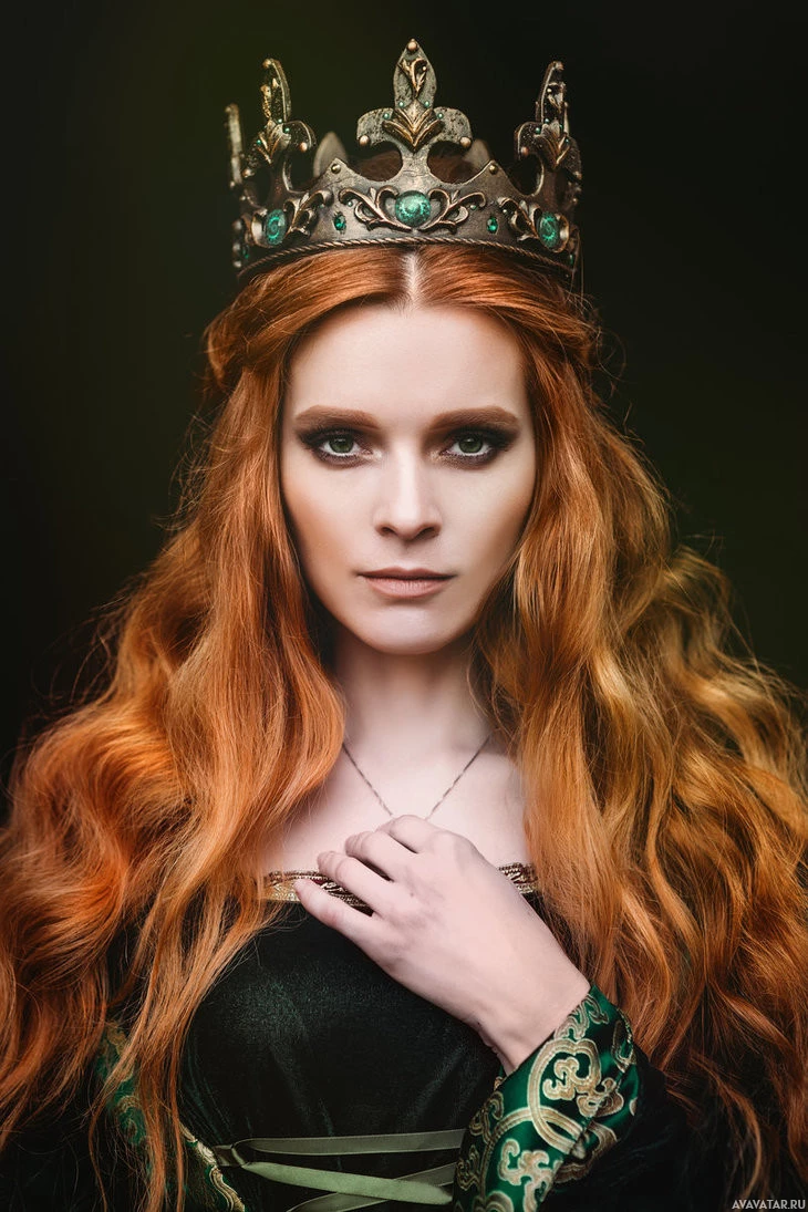 red hair wearing what appears to be a medieval or fantasy-style crown. The individual is dressed in attire that might suggest a historical or