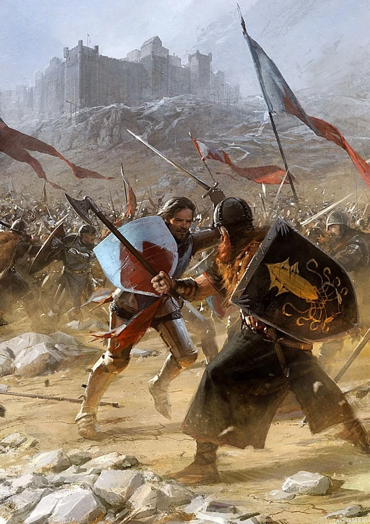medieval battle, with two warriors engaged in close combat. One is on horseback and wielding a sword, while the other is on foot and holding a shield. They are surrounded by soldiers from opposing sides, as indicated by the banners they carry, which feature different insignias. The setting appears to be an open battlefield with
