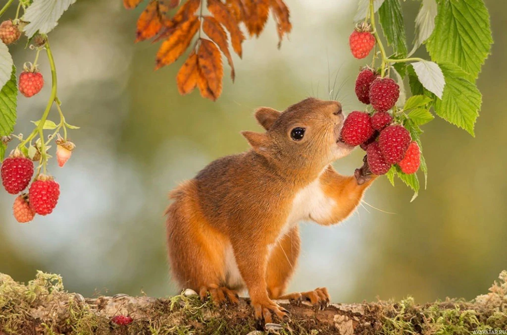 red berries, likely raspberries or similar fruits, within its reach. The squirrel is wearing