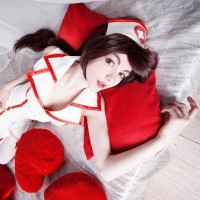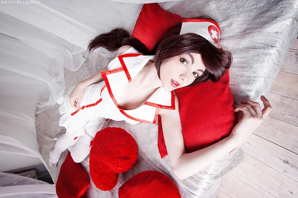 a white dress that resembles typical nursing attire, including a collar and red cross emblem. Surrounding the person are several red heart-