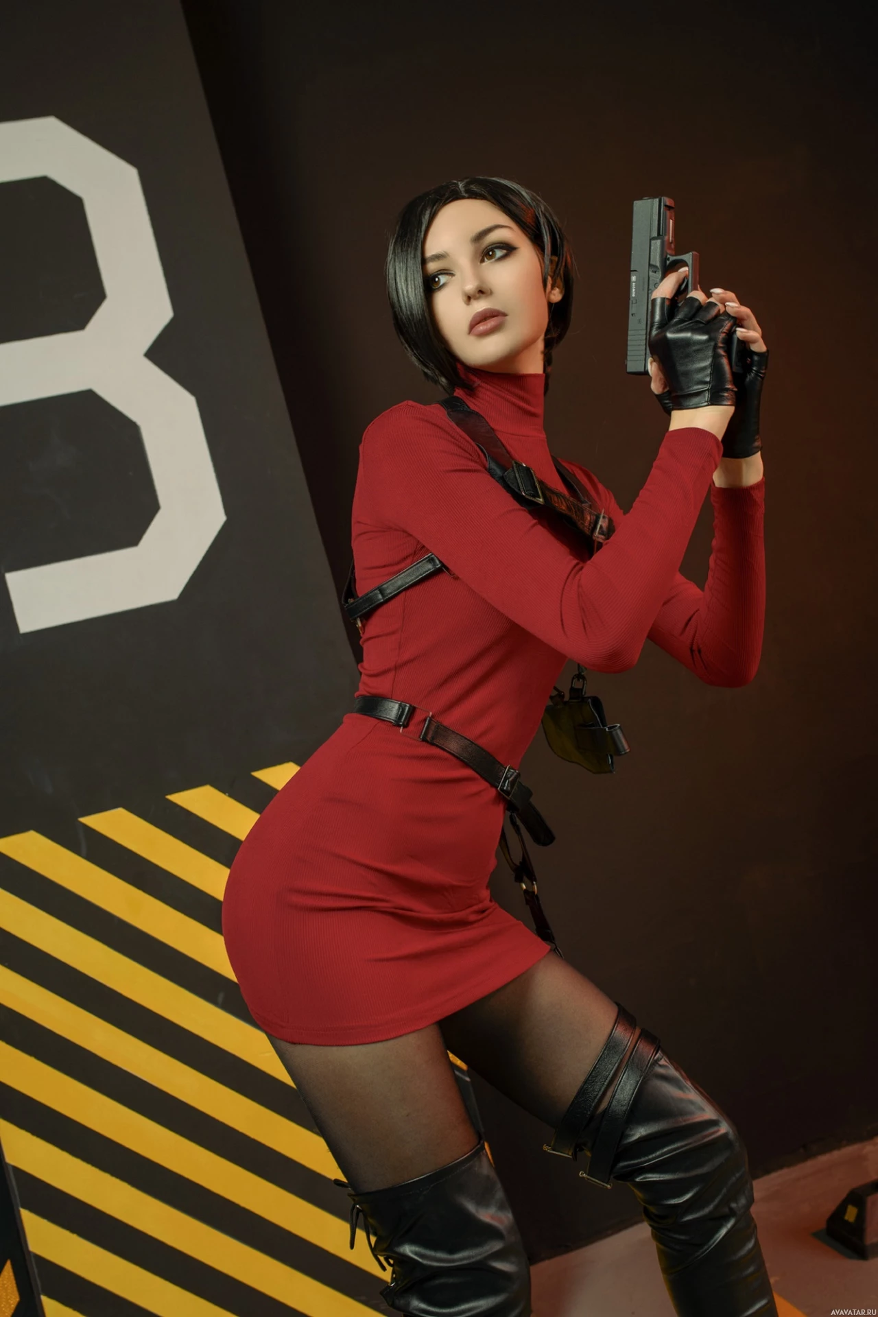 a combat readiness or possibly cosplaying as Ada Wong from the Resident Evil series, given the context of the prop and the style of her attire. The woman has long