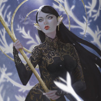 intricate patterns. She is holding what appears to be a staff or wand adorned with leaves, suggesting she might have