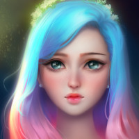 blue hair with pinkish highlights, and her makeup includes eyeliner and what appears to be blush on her cheeks. Her expression is neutral and she's looking directly at the viewer. The background is dark but there are hints of light that give