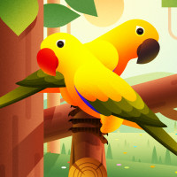 The image shows two parrots, one perched on a branch and the other sitting next to it. Both birds are facing towards the viewer with their wings spread out. They appear to be in