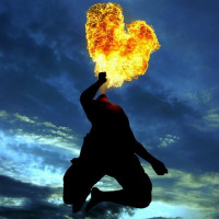 The image features a silhouette of a man in mid-air, captured with a dramatic and dynamic pose. He appears to be performing an action that resembles throwing fire from his hand or mouth, creating an interesting visual effect. The background is a cloudy sky, which gives the scene an intense atmosphere.
