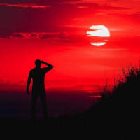 a silhouette of a person standing at the top of a hill or mountain during what appears to be sunset. The sky is a deep red, which suggests that the photo was taken during the late afternoon or early evening when the light from the setting sun creates