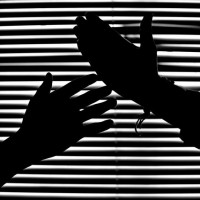 The image appears to show two hands touching or shaking hands, with a blurred background that suggests motion. It is a black and white photo, which gives it a dynamic and somewhat abstract quality due to the blur effect.
