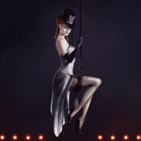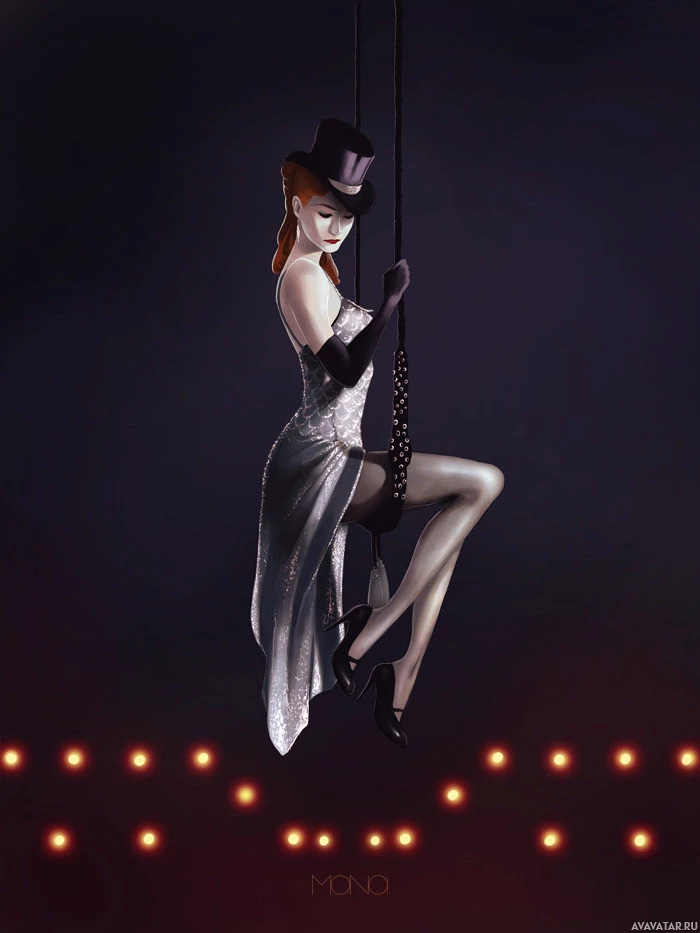 a long dress, hat, and boots. She appears to be swinging on a trapeze with one leg crossed over the other. The lighting suggests an evening or nighttime setting, possibly at a circus or similar venue, indicated by the string