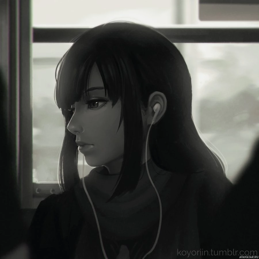 На картинке изображена девушка, сидящая в автобусе. У нее черные волосы, и она носит наушники на шее. Художественный стиль представляется цифровой иллюстрацией с капризной атмосферой.