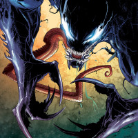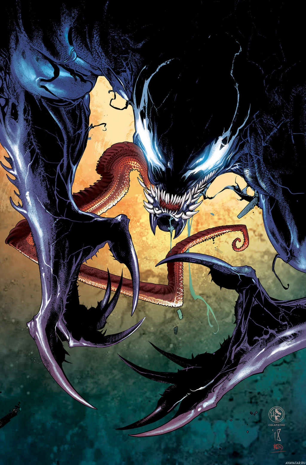 На данной картинке изображена иллюстрация Венома, персонажа из комиксов, опубликованных Marvel Comics. Персонаж показан в симбиотической форме с острыми зубами и когтями, угрожающими персонажу Человека-паука в сцене ближнего боя.