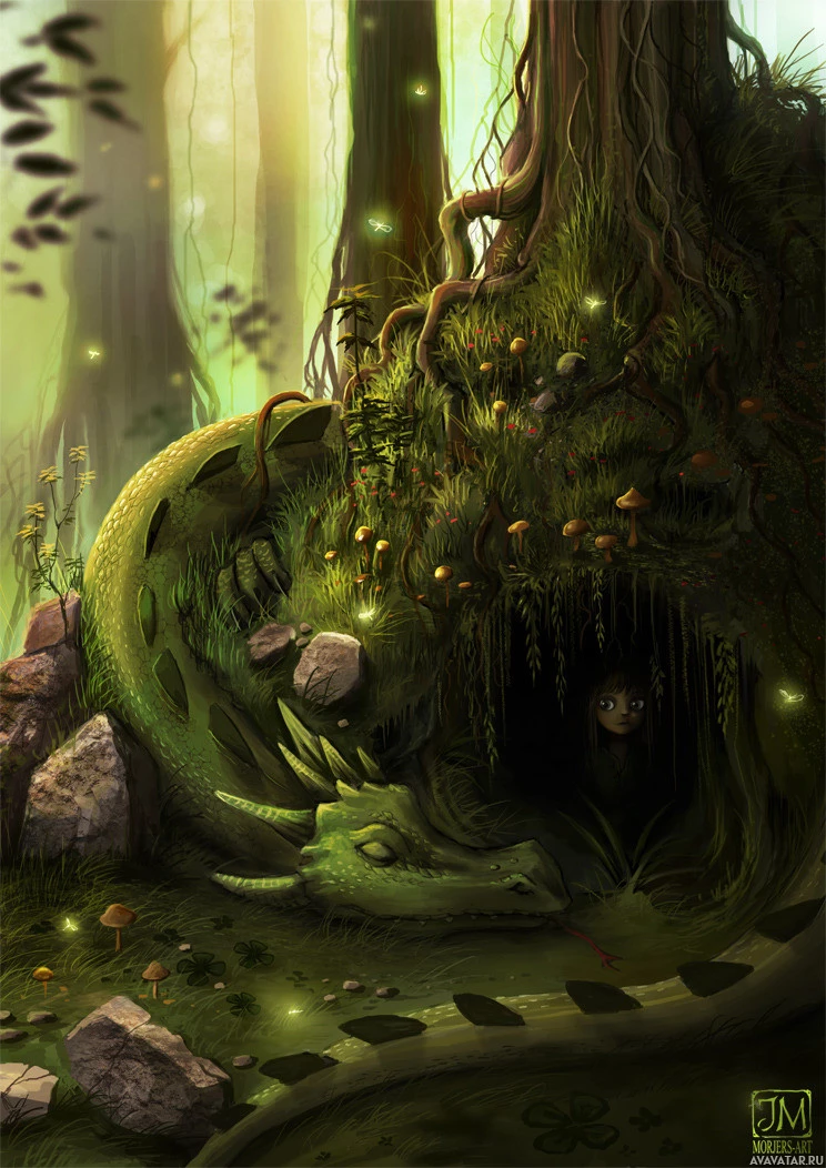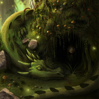 a fantasy scene with a green dragon resting on the ground. The dragon has scales that appear to be covered in moss or other vegetation, giving it an appearance that blends with its