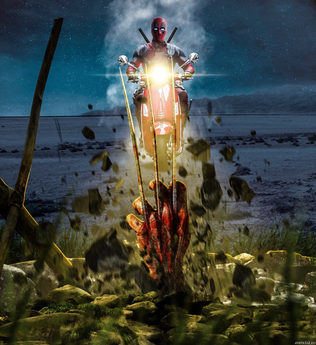 an action sequence with various pieces of debris flying around him. There's also another character that looks like Wolverine from the same publisher in the background, but he does not appear to be directly interacting with Deadpool in this