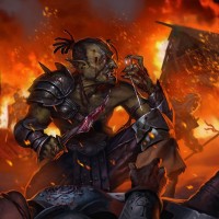 green skin, and sometimes horns in various mythologies and fictional stories like Middle-earth. The orc appears to be holding what looks like a blade that has been stained with blood, suggesting it may have just taken part in combat. The setting around the character is chaotic, with fire and smoke indicating some
