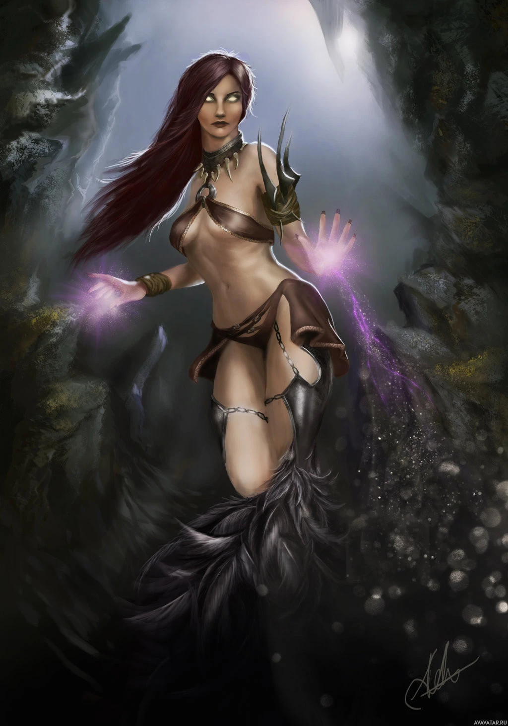 red hair, is wearing a brown outfit that resembles a costume with hints of leather and chains, and she has a stern facial expression. In her right hand, she's holding what appears to be a staff or wand. The background shows a dark cave-like environment with stalactites, a faint
