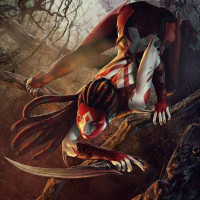 long hair, and is holding a sword. The setting seems to be a forest or jungle at night, given
