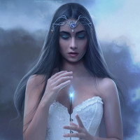 a fantastical scene with a dramatic sky that could imply an otherworldly or enchanted environment. The woman has