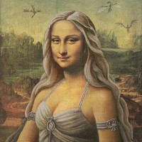 blonde hair, wearing a headpiece that is often associated with the character Daenerys Targaryen from the television series "Game of Thrones," portrayed by actress Emilia Clarke. The style of the painting is reminiscent of classical art, particularly the Renaissance period, and it features the woman looking directly at the viewer with