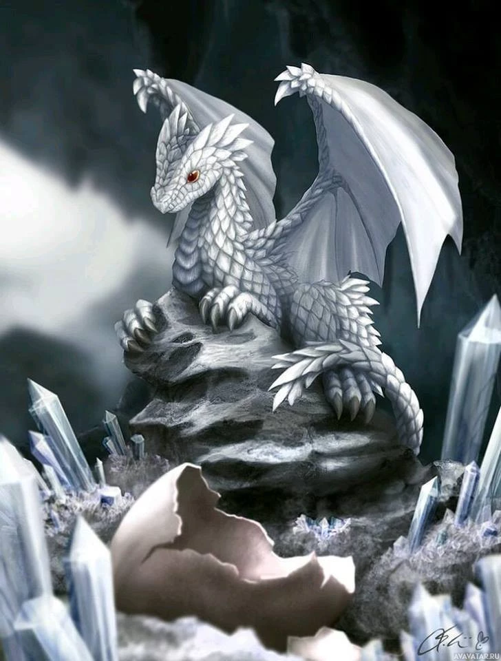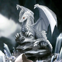 rocky surface with crystals in the background, suggesting a cold and possibly magical environment. The dragon itself has intricate scales that might imply a high level of detail or a symbolic representation of strength and majesty often associated with dragons in